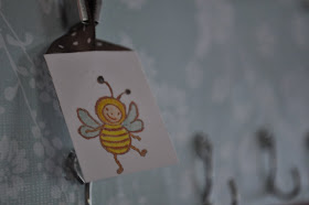 I snagged this sign from my son's school rummage sale last spring. I just covered it with paper and Mod Podge, then used a set of hooks and clips that I had lying around from Ikea. The two little bees and beehive are stamps from Stampin' Up.
